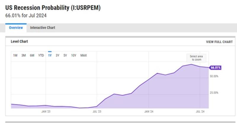 Actualmente, la probabilidad de recesión en EEUU a un año según Bloomberg es del 66%.