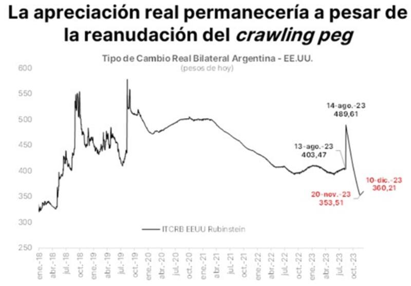 Para el día de asunción del próximo Gobierno, y contemplando el crawling peg prometido por el equipo economico, el TCR sería 10,7% menor, llevando la suba requerida para igualar este punto a 14,1% y 12%, respectivamente.