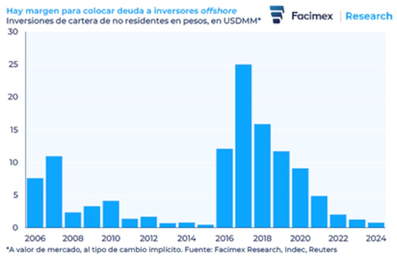 En esa línea, agregaron que, mientras trabaja para recuperar el acceso al mercado, el gobierno tiene margen para seguir colocando deuda en pesos a inversores offshore", afirmaron desde Facimex Valores.