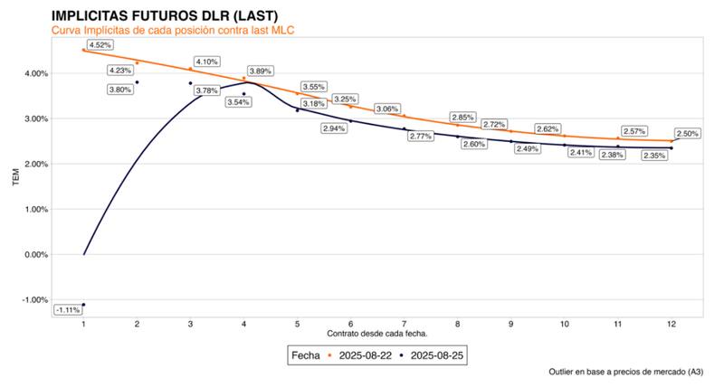 Ya sea por los contratos de futuros de dólar, así como el dólar break even a partir de las Lecap, el mercado pone precios a los activos que ubican al tipo de cambio por fuera de las bandas de flotación.