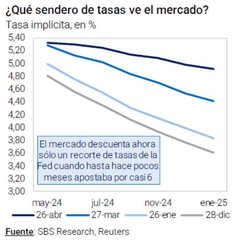 Los analistas de Grupo SBS remarcaron que, con los últimos datos económicos, el mercado siguió ajustando su expectativa con respecto a recortes en la tasa de referencia de la Fed, pasando a esperar sólo 1 recorte, cuando hasta hace pocos meses apostaba por casi 6.