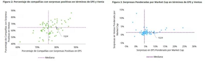 "Si evaluamos a la temporada de balances del primer trimestre de 2024 como porcentaje de compañías sorprendiendo las expectativas de los analistas en términos de Ventas y Ganancias, vemos que la misma se sitúa en el cuadrante inferior derecho. Es decir, puede ser calificada entre regular y buena. Si hacemos el mismo ejercicio, pero ponderamos las sorpresas por la capitalización bursátil de las compañías, volveríamos a calificar a la temporada entre regular y buena", dijo Lekovic.