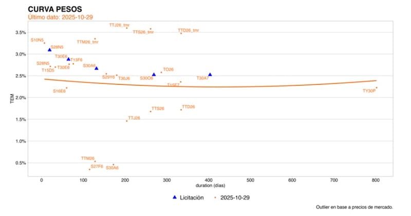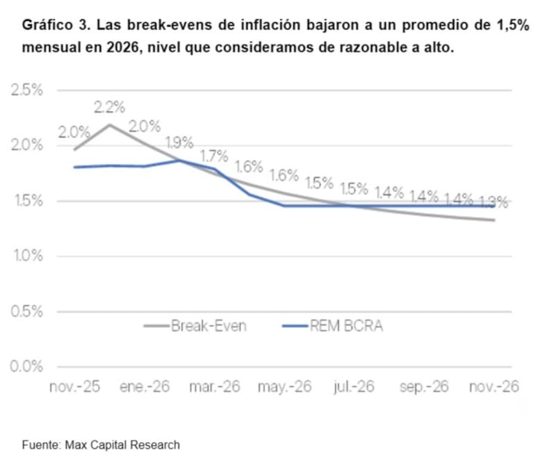 "Estimamos que las tasas reales deberían ubicarse aproximadamente 300 pb por debajo de los rendimientos en dólares, por lo que, con rendimientos en dólares alrededor de 13%, esperamos una compresión adicional hacia 10% en el tramo medio y largo. En cuanto a tasas nominales, esperamos que las expectativas de inflación se ubiquen en torno a 18%, por lo que proyectamos tasas cercanas a 25%. Preferimos los Bonte26 y Bonte30, donde también mantenemos posiciones largas", dijeron desde Max Capital.