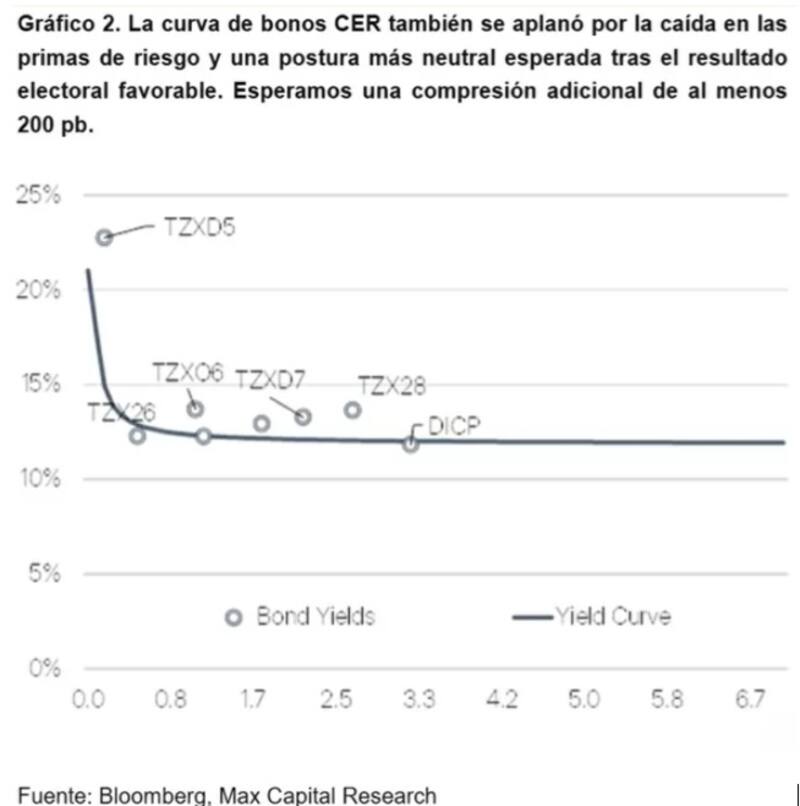 "En ese escenario trabajamos con proyección de tasas reales positivas en los próximos meses, pero en niveles considerablemente inferiores a los actuales. Consecuentemente vemos una mayor potencialidad de compresión de spreads por ejemplo en la deuda CER 2026 en adelante. En menor medida, pero también visión constructiva, respecto a la reducción de rendimientos de instrumentos tasa fija en pesos 2026", afirmaron.