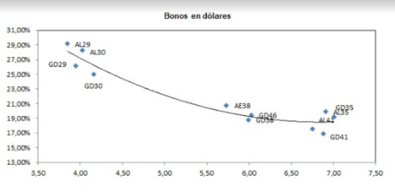El hecho de que la curva de deuda soberana se mantenga invertida, con rendimientos en el tramo corto del orden del 29% para la ley local y del 26% para la ley internacional, junto con paridades debajo de 40%, hace suponer que el mercado aún desconfía de la capacidad y/o voluntad de pago del Gobierno respecto de sus compromisos de deuda.