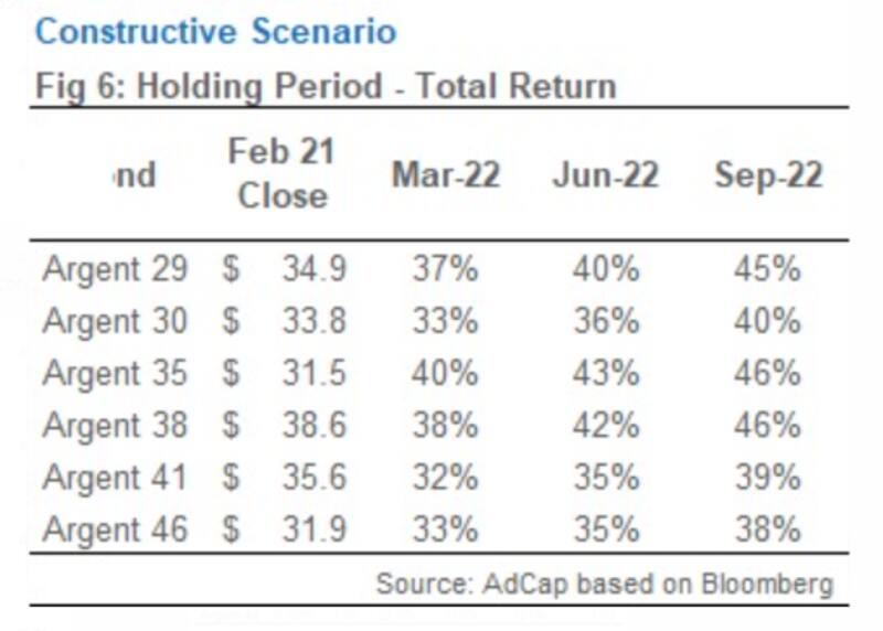 Suponiendo que la Argentina llegue a un acuerdo total en marzo, los analistas de Adcap Grupo Financiero recomiendan comprar los Globales y les asignan subas de hasta 43% en los próximos tres a cuatro meses. Ven especial valor en los Globales 2035 y 2038.
