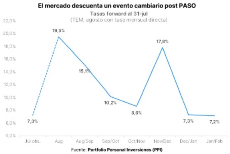 "La presunción es que el oficialismo, por obvias razones políticas, podría ajustar el dólar oficial tras las PASO. Como muestra de ello, el futuro de dólar de agosto se disparó 6040 puntos básicos, de 169,4% el viernes a 229,8% ayer, equivalente en tasa efectiva anual a un salto de 386,6% a 715,7%", señalaron.