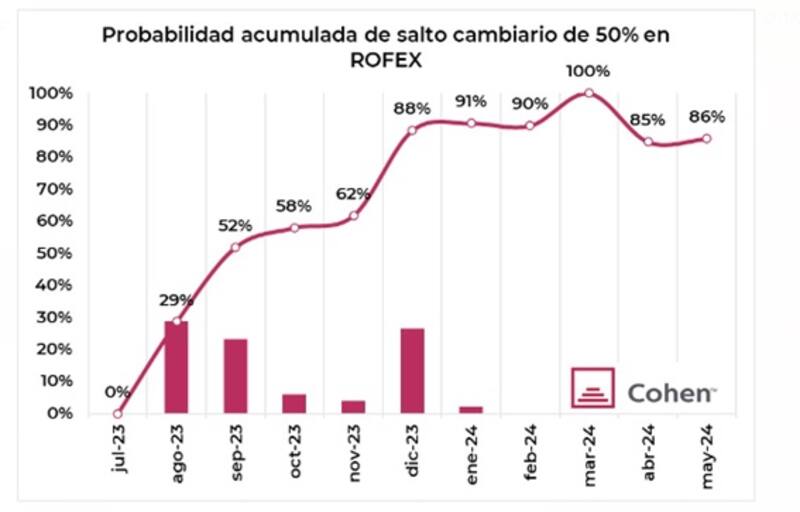 Según estimaciones de Cohen, el mercado ve que las chances de que haya una devaluación del tipo de cambio oficial de 50% es de 29% en agosto, creciendo al 52% en septiembre y pegando un salto discreto en diciembre, ubicándose en torno al 90% y 100% acumulado entre dicho mes y mayo de 2024.