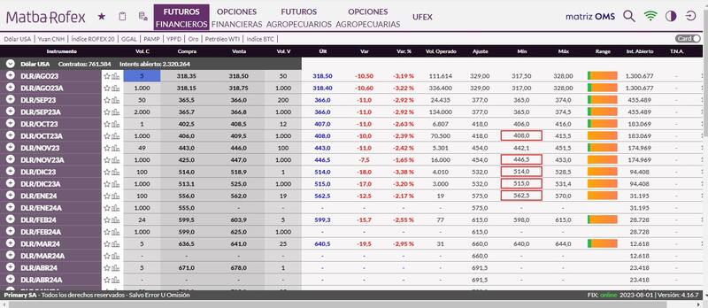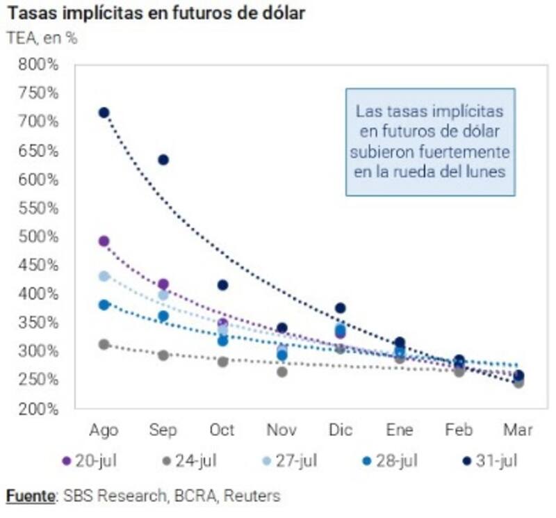 La tasa efectiva anual del contrato de dólar futuro a agosto superó hoy el 700% (desde el 380% el viernes), mientras que para los contratos a septiembre se ubicó cerca de 630%, casi el doble del 362% del viernes, en ambos casos fuertemente teñidos de especulaciones políticas.