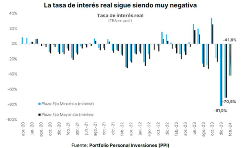 "Con una inflación de 20,6% en enero, la tasa real ex post de un plazo fijo fue de -70,6% anual (-9,6% mensual), mejorando desde un mínimo histórico de -81,9% anual diciembre. Si la inflación fuera 14% en febrero, la tasa real sería -41,8% anual, o -4,3% mensual", puntualizaron desde PPI.