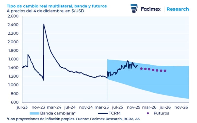 “El gobierno ratificó las bandas en múltiples oportunidades y el mercado parece, de momento, asignar una alta chance a que efectivamente así suceda. Futuros de tipo de cambio se ubican dentro de la banda hasta abril de 2026, a la vez que los pares CER/DL para mediados de 2026 descuentan un aumento muy moderado del TCR desde los niveles actuales”, explicó Franco.