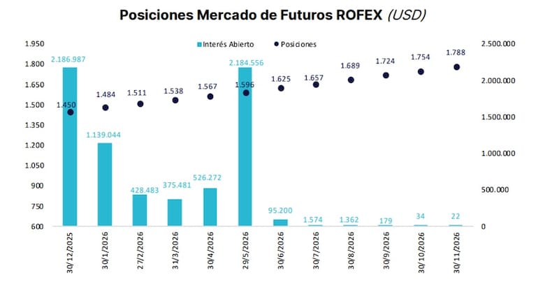 Para los tres meses siguientes, los precios reflejan que la suba en el dólar correría en niveles en torno al 1,8%: 1,7% en enero ($1.486), 1,8% en febrero ($1.513) y 1,8% en marzo ($1.542). A partir de ahí, los precios señalan una devaluación que continúa al ritmo de 1,8% promedio hasta noviembre del 2026.