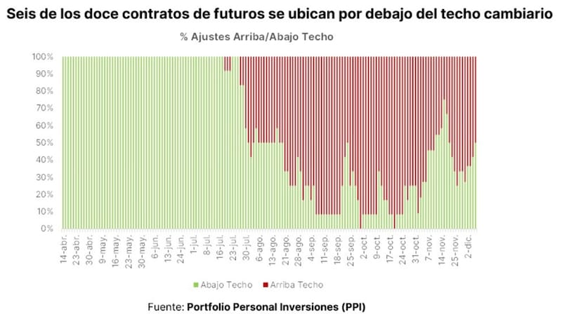Los analistas de Portfolio Personal Inversiones (PPI), reconocen que seis de los doce contratos de dólar futuro se ubican por debajo del techo cambiario establecido por las bandas de flotación.