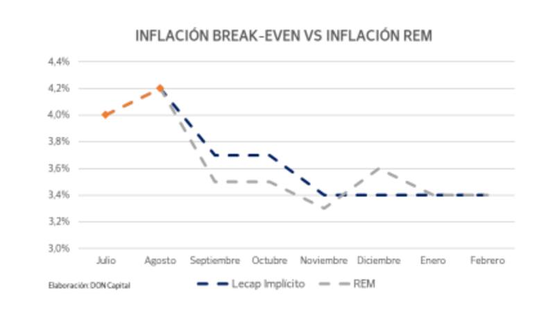 Actualmente, la curva de break even, que compara los rendimientos de Lecap con Boncer, proyecta una inflación del 4% para octubre y promediando alrededor del 3,75% para fines de año.