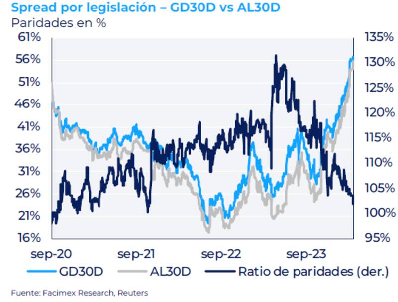 "El GD30 quedó con una paridad de 56,88% y el AL30 cerró con una paridad de 55,90%, un ratio de paridades de 1,018 entre ambos bonos. Este diferencial por legislación prácticamente nulo se dio en ocasiones muy puntales desde la reestructuración del 2020", comentó.