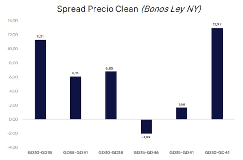 Para Casabal, "en niveles por debajo de 3% de spread (el GD35 se vende a 0,1% más que el AL35) luce muy barato hacer el pasaje a Ley NY que a la larga debería volver a ese 3% histórico".