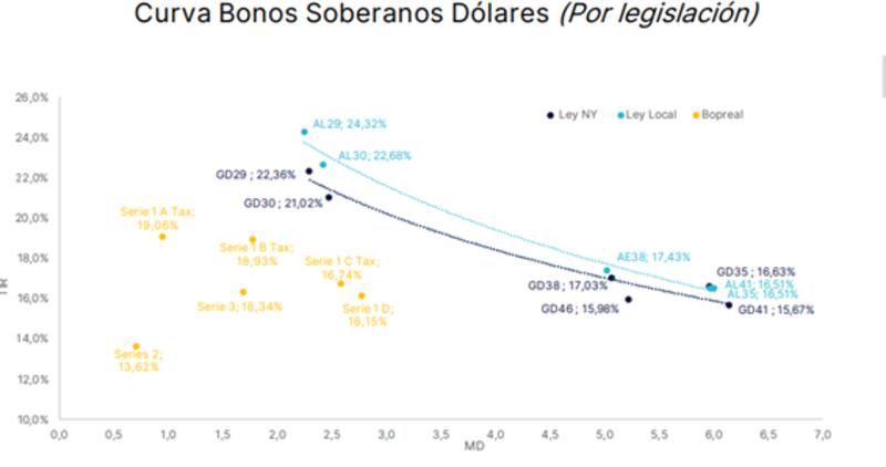 El diferencial por legislación entre los distintos bonos dentro de la curva argentina cae a mínimos de 0,1%, muy lejos del 9% en promedio de largo plazo.