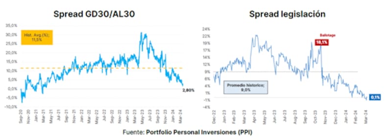 "Vemos atractivo en hacer un swap desde AL30 hacia GD30 aprovechando el bajo spread por legislación. Incluso cuando esperamos que el spread por legislación se mantenga en mínimos, el trade permite ganar protección legal casi sin resignar paridad", detalló.