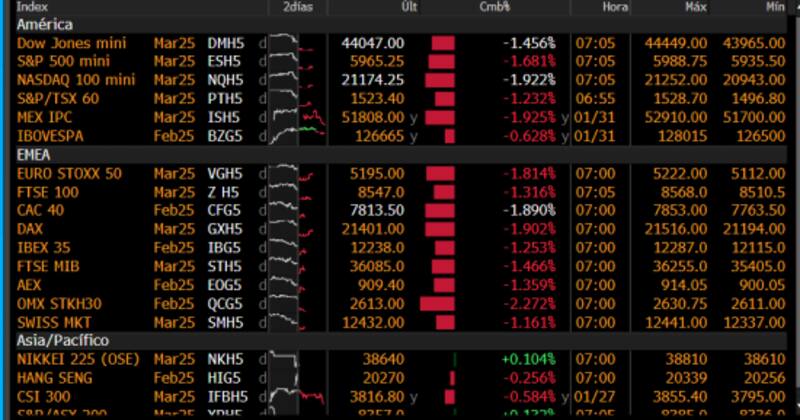 Los mercados financieros globales inician el mes de febrero con fuertes bajas luego de que Trump haya ordenado elevar los aranceles a la importación a sus principales socios comerciales.