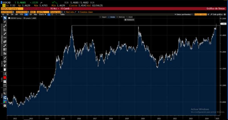 Afectados por la medida, el dólar canadiense se devalúa 1% y cotiza en máximos históricos. El peso mexicano también se devalúa 2% y opera en su mayor valor desde 2022.