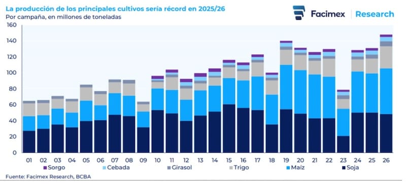 Se espera que, entre el sorgo, la cebada, el girasol, el trigo, el maíz y la soja, la campaña de 2025 y 2026 alcance los 150 millones de toneladas.
