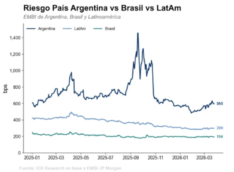“Hacia adelante, si bien mantenemos una visión constructiva sobre la deuda argentina, la combinación entre un escenario global aún tenso y la ausencia de drivers claros en el frente local reduce la probabilidad de una compresión significativa del riesgo país en el corto plazo. En este contexto, esperamos que el indicador continúe lateralizando dentro del rango actual”, comentaron desde IEB.