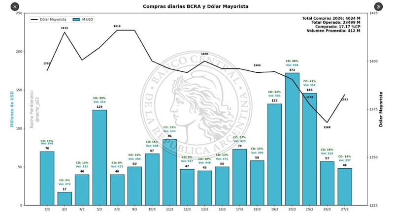 Lleva 56 ruedas de compras consecutivas, acumulando en marzo u4s 1322 millones y más de u$s 4000 millones en 2026, todo ello antes de la liqiudacion gruesa del agro.
