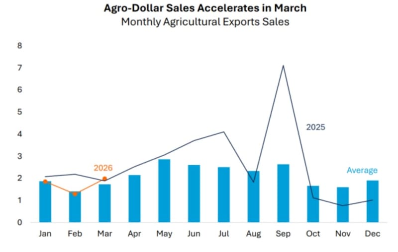 De ese total, unos u$s 31.700 millones corresponden solamente a soja y maíz, cuyos precios subieron en promedio 4,3% y 5,0% en marzo frente a febrero.