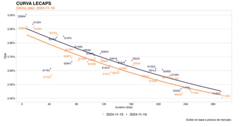 Las tasas de las Lecap comprimieron a la baja en las últimas semanas, pasando de niveles de 50% y 44% de TNA a finales de octubre, pasa situarse ahora en niveles de 44% (TNA) en el tramo corto a 34% (TNA) en el tramo más largo.
