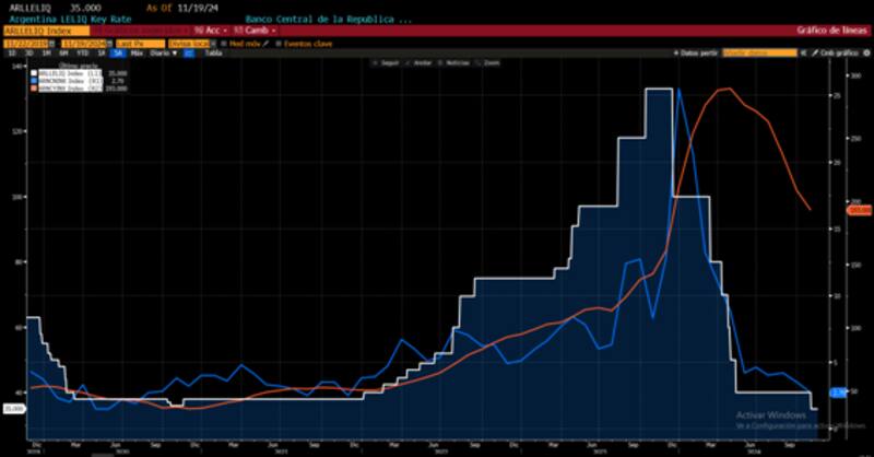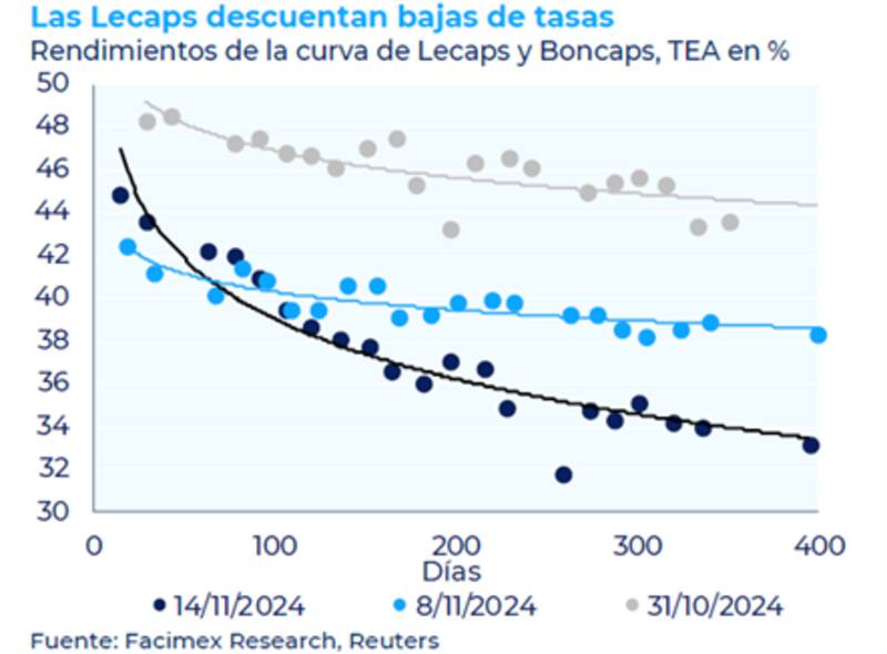 "El mercado se prepara para ver una macro con una inflación más baja así como también con un ritmo cambiario más bajo. En ese contexto, no llamaría la atención que el BCRA busque también bajar la tasa de interés. El mercado anticipa una menor nominalidad, con menor inflación y con recorte de tasas del Banco Central con la compresión de curva de Lecap, tal como lo hizo previo a la última baja de tasas del 40% al 35%"