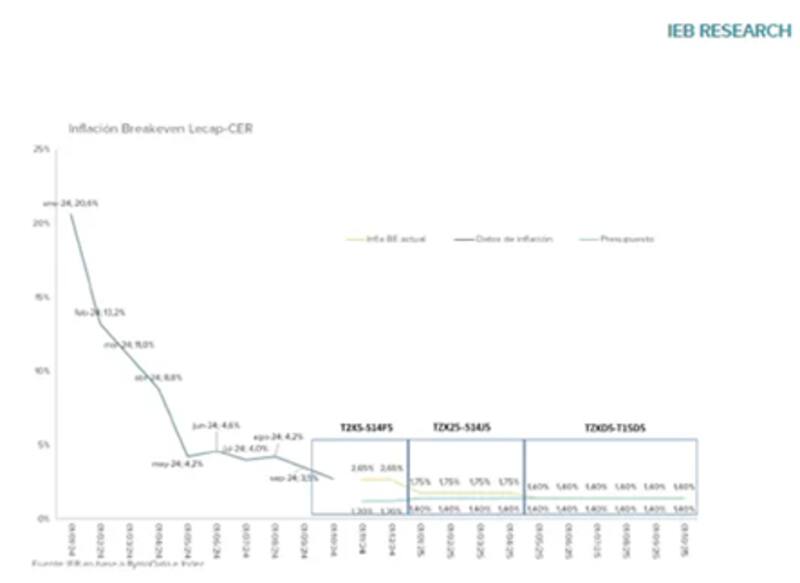 Maximiliano Bagilet, team líder de TSA Bursátil, afirmó que "con la baja en las tasas de las Lecap y los bonos CER comprimiendo, el mercado incorpora a precios una inflación de 1,5% mensual promedio para gran parte de 2025".