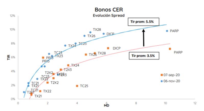 “Las emisiones de bonos dólar linked por $ 265.000 millones bajó la demanda de bonos CER para armar coberturas sintéticas y eso desplazó la curva de rendimientos hacia arriba. Hacia adelante, vemos un mayor atractivo, en especial en el tramo medio y largo de la curva (del TX23 al TX26) , comentaron.