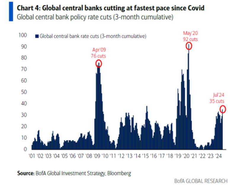 Según datos de Bank of América, durante el último trimestre se dieron 35 recortes de tasas de los bancos centrales a nivel global, siendo el más alto desde 2020.