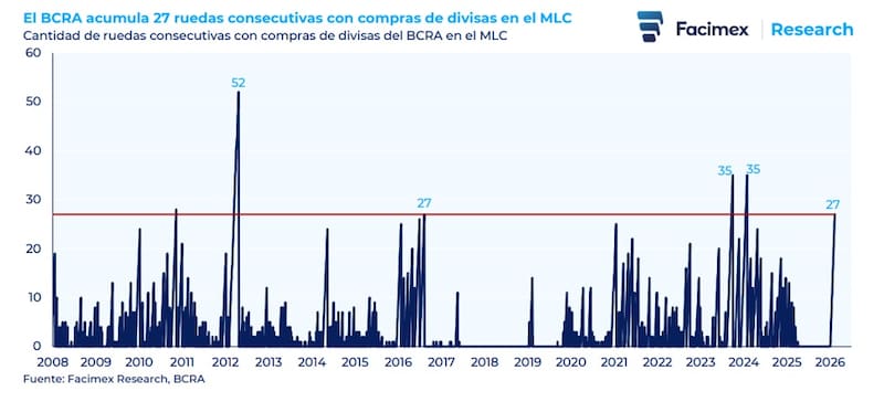 “El BCRA compró divisas de forma ininterrumpida en las últimas 28 ruedas. Se trata de la tercera mejor racha de la última década, solamente por debajo de las compras acumuladas en septiembre de 2023 con la introducción del dólar blend 75-25 para la soja y enero de 2024 con un tipo de cambio real muy elevado y mínimos pagos de importaciones (ambas con 35 ruedas consecutivas)”, dijeron desde Facimex Valores.