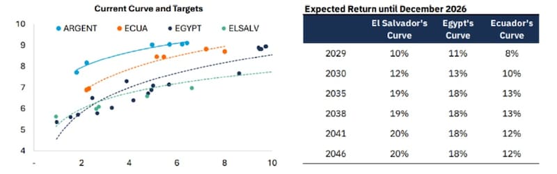 Según sus cálculos, en el caso en el que la deuda argentina pase a operar con tasas similares a las de El Salvador, los bonos soberanos podrían avanzar entre 10% y 12% en el tramo corto y entre 19% y 20% en el tramo largo.