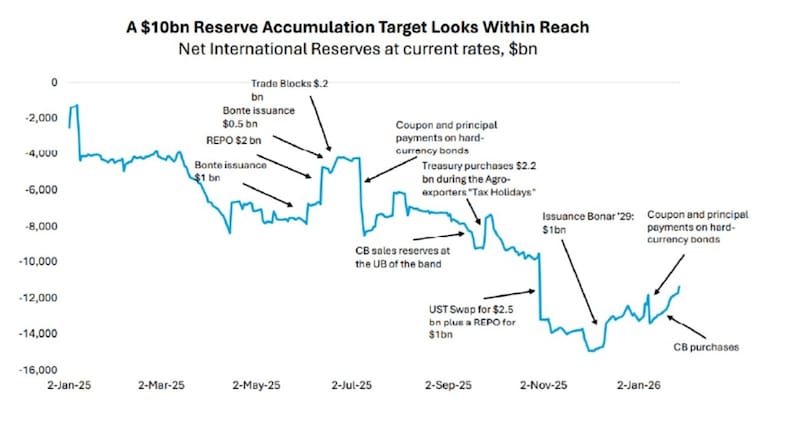 “Si este combo se materializa, el impacto sobre los bonos soberanos en dólares debería ser positivo, al mejorar la solvencia intertemporal y reducir el riesgo país. A su vez, mayores reservas funcionarían como ancla para el tipo de cambio, reduciendo la probabilidad de shocks discretos y reforzando la estabilidad cambiaria, siempre que el proceso no derive en un atraso excesivo del tipo de cambio real”, dijeron.