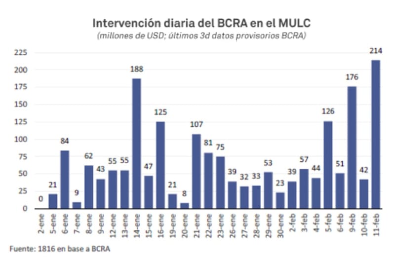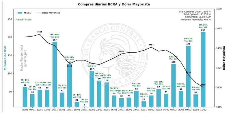 En el día de ayer, el BCRA compró u$s 214 millones, habiendo registrado la mayor adquisición diaria del año y suma en el 2026 un total de u$s 1906 millones.