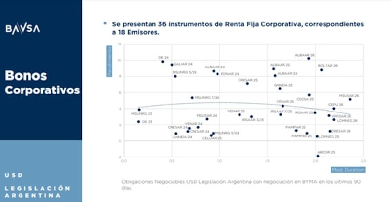 Según datos recopilados por los analistas de Buenos Aires Valores, las curvas de bonos corporativos de ley local operan con tasas del tramo muy corto de entre 2% y 4% en dólares.