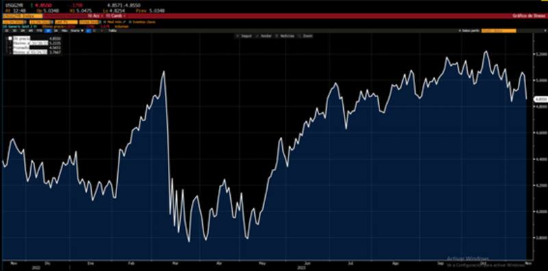 La tasa a un mes se ubica en 5,38%, mientras que a 3 meses se encuentra en 5,4%. Por su parte, los bonos a 2 años se sitúan en 4,85% y bajan a 4,46% en los bonos a 10 años.