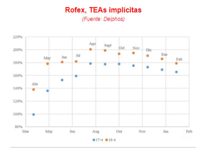 De hecho, en abril ya se espera una devaluación implícita de 106% (TNA), seguido de los plazos de entre mayo a julio, con tasas de entre 107% al 120%.