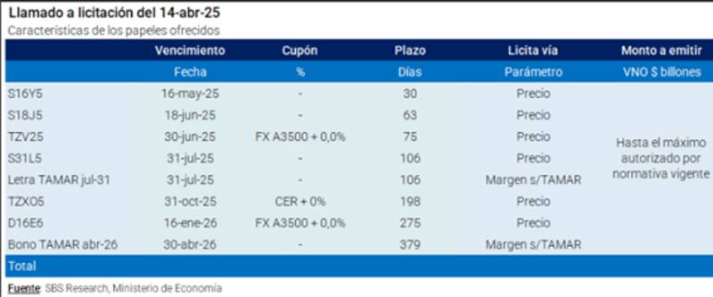 En el día de hoy vencen $ 6700 millones, y se licitarán tres Lecaps cortas (S16Y5, S18J5, S31L5), dos Boncer (TZXO5, TZXO6), dos dólar-linked (TZV25, D16E6), y dos nuevos bonos que devengarán la tasa TAMAR, uno que vence en julio de este año y otro en abril del 2026.