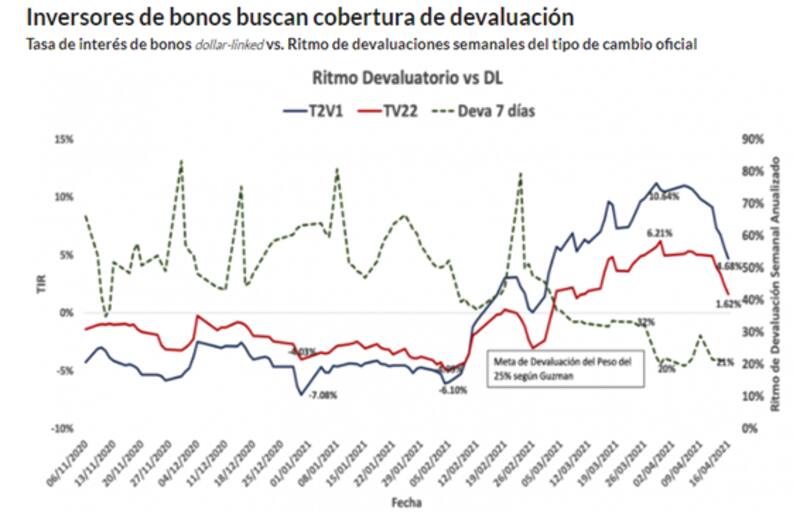 "Creemos que a este ritmo de inflación, el ritmo de devaluación debería aumentar en los próximos meses. En este sentido nos gusta el bono dólar linked a 2022 (TV22) que, si bien estuvo subiendo bastante estas últimas semanas, puede ser una opción interesante de cobertura frente a presiones alcistas del tipo de cambio cerca de las elecciones. El bono soberano dólar linked a 2021 (T2V1) si bien tiene una tasa mayor, al tener fecha de vencimiento cercana a las elecciones corre el riesgo de que el gobierno pueda mantener controlado el tipo de cambio hasta ese momento", afirmó Viveros.