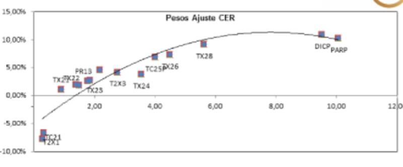 La deuda que ajusta por CER rinde hasta -7% en el tramo corto, aunque ya en 2022 aparecen rendimientos reales positivos del 1% y hasta 10% en el extremo más largo.