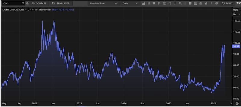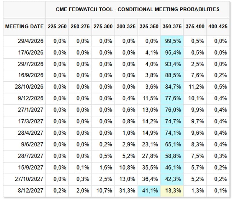 Sin embargo, la fuerte suba del petróleo provocó un giro de 180 grados en tal expectativa y el mercado ahora no ve cambios en la tasa de interés hasta fin de 2027, es decir, se espera que la Fed deje la tasa en el actual rango de 3,5% y 3,75% por el próximo año y medio, al menos.