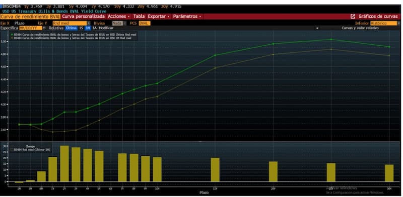 En el ultimo mes, el tramo corto de la curva de bonos del tesoro de EEUU se desplazó al alza en 30 puntos básicos, mientras que el tramo medio y largo subió entre 15 y 20 puntos básicos.