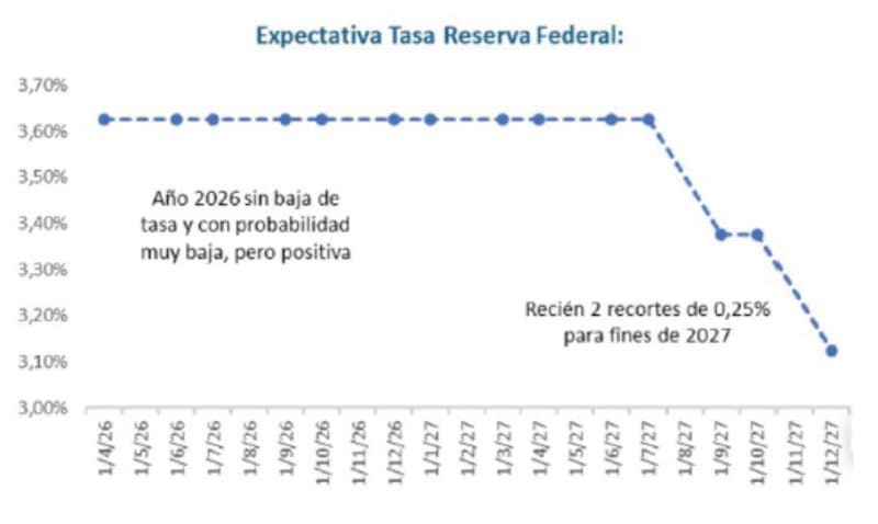 “De dos recortes esperados en 2026, como esperaba el mercado preanuncio del cambio de titularidad de la Fed, a un nuevo escenario con estos inputs, donde ya se opera sin recortes esperados en 2027, donde aparecen probabilidades muy bajas (antes inexistentes) de suba de tasas. Los recortes recién quedarían para 2027 y las curvas de futuros muestran que se espera que duren poco tiempo”, sostuvo Benítez.