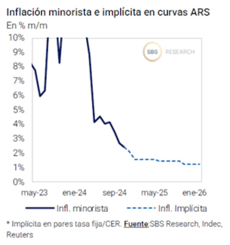 "Los bonos descuentan un escenario de fuerte desinflación reflejado en una curva invertida, con tasas de inflación de equilibrio en niveles de 2,4% para diciembre, 1,7% en los primeros 4 meses de 2025 y 1,5% mensual para el resto de 2025. Este escenario es ligeramente más optimista que nuestro escenario base, en el que vemos que la inflación alcanzará el 24,9% en 2025 en comparación con el 20,5% descontado por el mercado. Vemos poco margen para que la inflación se dispare mucho más allá de su velocidad actual", afirmaron.