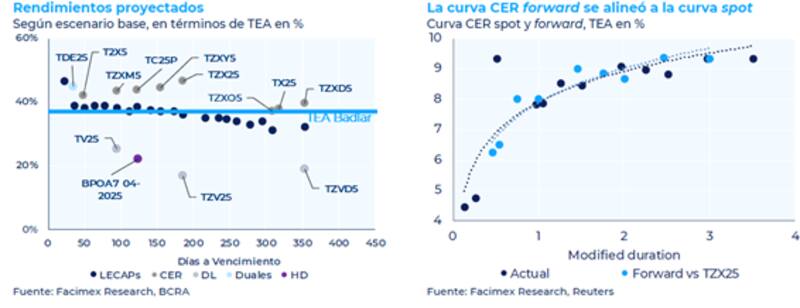 "Hoy una Boncap y Lecap larga ofrece una rentabilidad de 32% TNA, al tiempo que una Lecap corta rinde 33% TNA. En cuanto a los bonos CER, los largos rinden CER +8,5% y los cortos CER +3,8%. A estos precios, la inflación breakeven para 2025 es del 20% interanual, en tanto que nuestra proyección es ligeramente más alta en 23% interanual", afirmó.