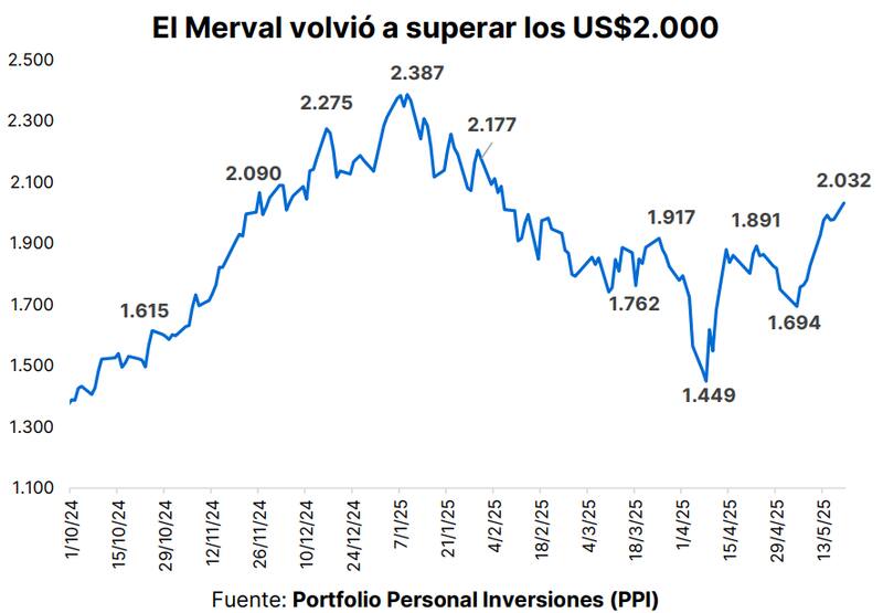 Tras el avance de 1% que registra este jueves, el índice de acciones locales supera los u$s 2000 y se acerca un poco más al récord de u$s 2400 que alcanzó en enero. Desde el piso de u$s 1450 que tocó el mes pasado, acumula un repunte de 40%, impulsado por la celebración tras el nuevo acuerdo con el FMI y la eliminación parcial del cepo cambiario.