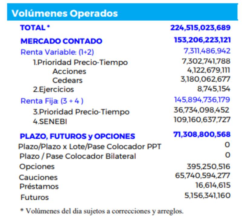 Por otra parte, el volumen operado en acciones del Merval alcanzó los $ 4122 millones, una rareza para lo que se suele ver en el día a día. En tanto, los Cedear movieron $ 3180 millones.